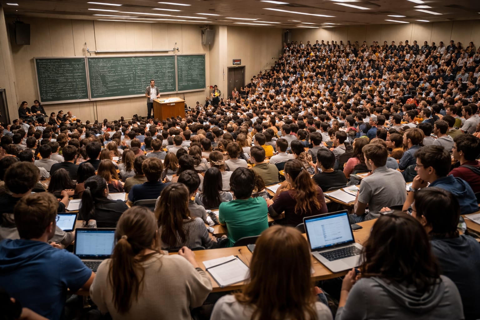 La leçon commence. Ou plutôt elle tente de commencer. La voix de l’enseignant s’élève, se perd, revient en écho contre les parois. Les premiers rangs entendent encore. Les derniers devinent seulement qu’un savoir circule quelque part, comme une rumeur lointaine. Entre les deux, il y a cette mer humaine où l’attention se dilue, où l’esprit, faute d’espace pour se tenir droit, finit par se recroqueviller.